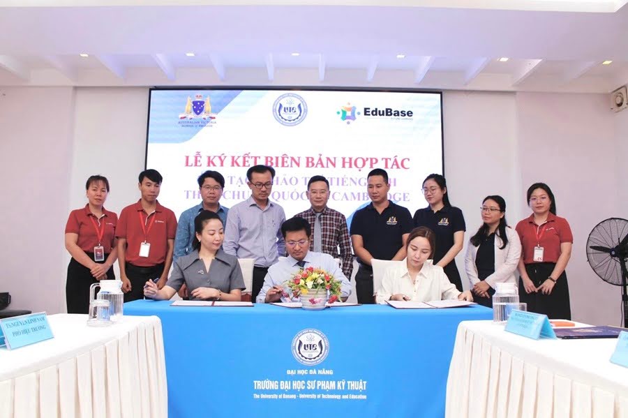 Tiếp nối sự thành công của buổi ký kết cùng trường Đại học Sư phạm – ĐHĐN vừa qua, hôm nay (ngày 13/7/2023), Công ty TNHH Giáo dục nền tảng – Edubase cùng trường Đại học Sư phạm Kỹ thuật – ĐHĐN và Công ty Cổ phần Giáo dục quốc tế Victoria – Australia đã tổ chức Lễ ký kết biên bản hợp tác đào tạo, khảo thí tiếng Anh theo chuẩn quốc tế Cambridge cho sinh viên nhà trường.